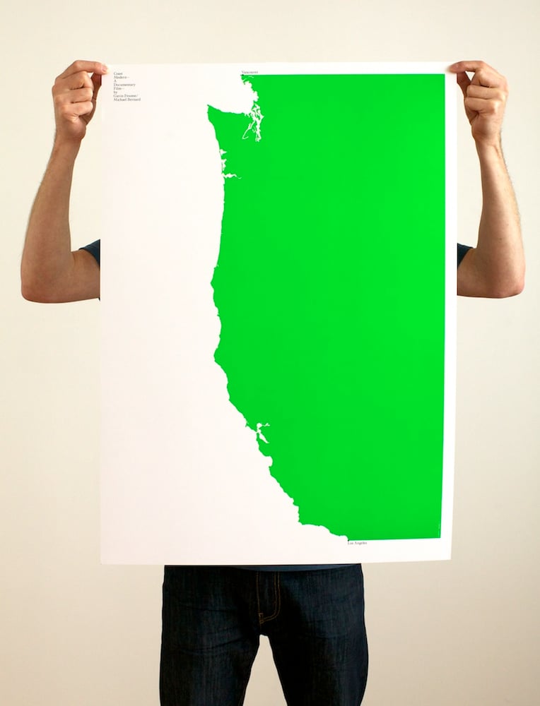 Michael C. Place originally kicked off our Coast Modern fund raising by designing the now SOLD OUT Pantone pink poster back in 2010. We’re celebrating the development of our new film DenseCity by releasing this understated stunner in Pantone green. Spanning the coast from Vancouver to Los Angeles, this slice of design heaven will jump off any wall. Printed masterfully on 100lb Topkote paper stock.